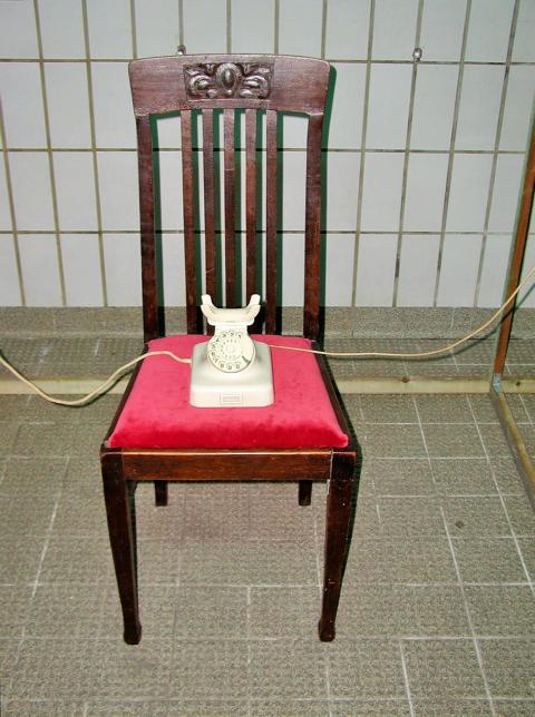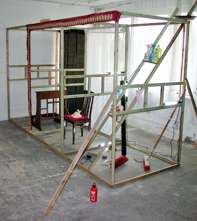 SUB ROSA kippt aber schon beim ersten Anblick die dunkle, flüsternde Heimlichkeit hinter geschlossenen Beichtstuhltüren und vorgezogenen Vorhängen sofort ins Helle: Hier ist der Zugang zum Mysterium von Schuld und Sühne mit lächelnder Ironie hin zu offener Kommunikation gewendet. Deren buchstäbliche „Rahmenbedingungen“ sind klar und im nahezu klinisch weiß gekachelten einstigen Kühlraum der Alten REWE-Halle wirken die Hinweise doppelt – und das in beide Richtungen: So verbindet z.B. ein weißes Telefon aus dem Weit-Oben und Außen die beiden virtuellen Gesprächspartner. Im Raum finden sich Reinigungsartikel aller Art und eine zur übergroßen Pfeilspitze verkürzten stufenlosen „Leiter“ – Ausschnitt reinigender Sühnemaßnahmen „en gros et en détail“ inklusive innerer Ausrichtung…